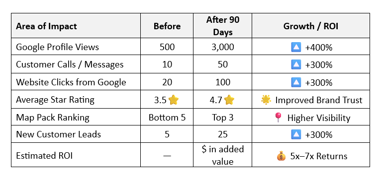 A $100 investment in expert Google Business management can yield 5–7x returns through higher visibility, better reputation, and more customer actions all without increasing your ad budget.
